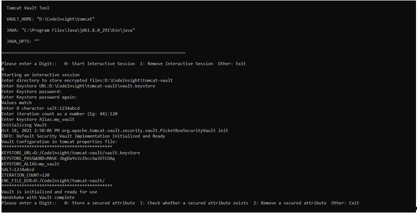 vault.bat --keystoreD:\CodeInsight\tomcat\tomcat-vault\vault.keystore--keystore-passwordpassword123--aliasmy_vault--enc-dirD:\CodeInsight\tomcat\tomcat-vault--iteration120--salt1234abcd--generate-configD:\CodeInsight\tomcat\conf\vault.properties -