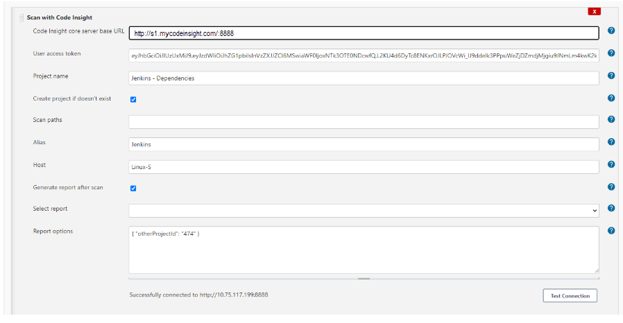 If you have not configured report generation (see the previous step), click Test Connection to test your connection to Code Insight.