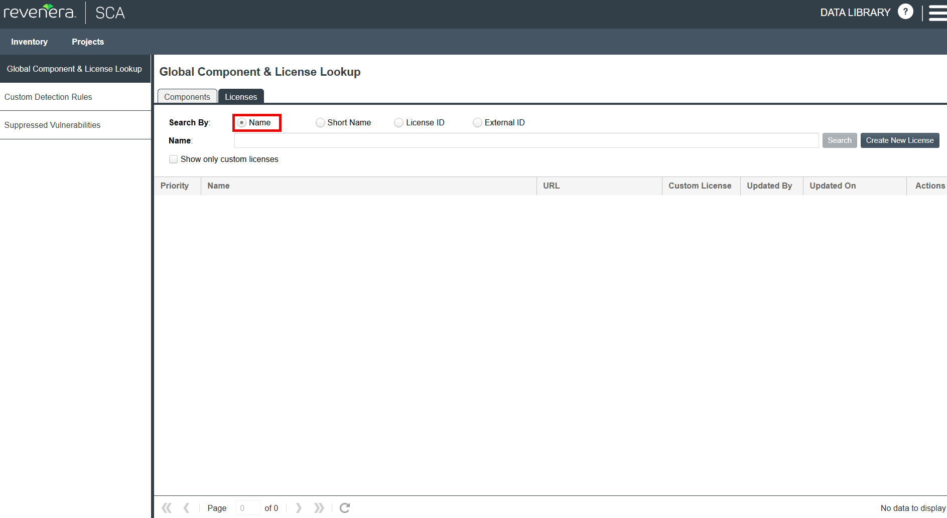 Starting in this release, a new search option, Name, has been introduced on the Licenses tab of the Global Component & License Lookup tab. This option enables users to search for licenses in the Code Insight Data Library by entering a string associated with the license name. To use this search criterion, input a string of at least three characters that appear in the license name into the associated Name field.