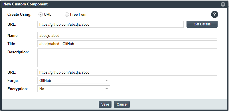 • If Code Insight does not recognize the URL as belonging to a supported domain (that is, it is unable to parse the URL), the New Custom Component window opens showing the URL only. You must click Get Details to complete the component fields manually in Free Form mode. (Click OK on the “Unable to parse URL...” message box to proceed to Free Form mode.)