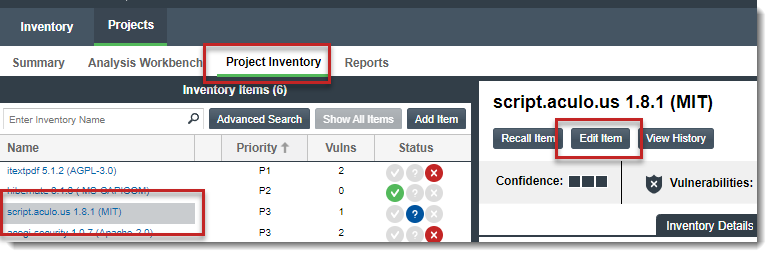 4. Click the Edit Item button in the header of the Project Inventory Details pane.
