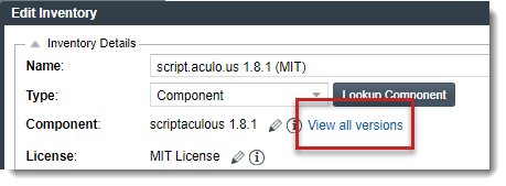 5. In the Edit Inventory window for the inventory item, locate the Component field and, next to the item’s component name and version, click View all versions.
