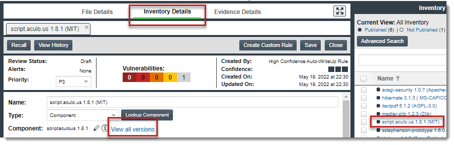 3. On the Inventory Details tab, locate the Component field and, next to the item’s component name and version, click View all versions.
