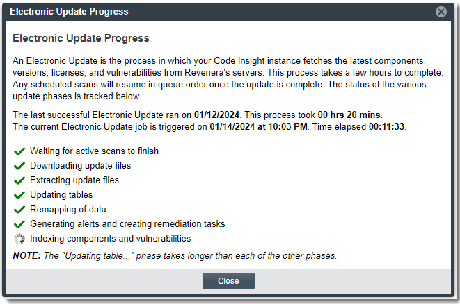 The following instructions describe how to monitor the progress of each phase in a currently running Electronic Update. This task is performed by clicking the “here” link in the Electronic Update notification message displayed on each Code Insight page when an update is in progress. (For more information about the message, see Electronic Update Notification.)