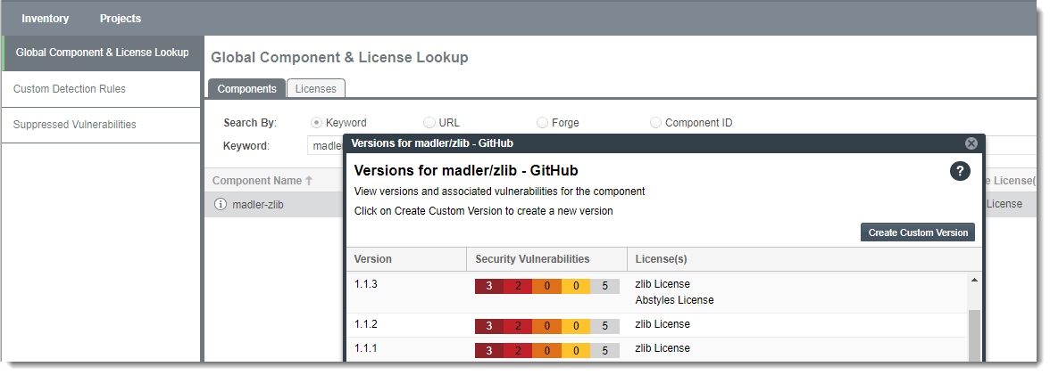 These counts exclude any vulnerabilities that were suppressed globally for the given component version. Additionally, while the counts for a component version are generally the same as the vulnerability counts for an inventory item associated with the component version, the inventory item counts can be fewer if vulnerabilities were suppressed for the item at the project level.