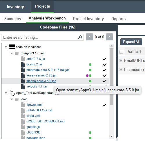 When you hover over a file name in the codebase tree, the name is shown in an <alias>:<relativeFilePath> format, where <alias> is the alias of the Scan Server or scan agent and <relativeFilePath> is the file path relative to the absolute scan-root path on host instance. (See the following example where, when a user hovers over the codebase file lucene-core-3.5.0.jar, located directly under the scan folder myApp3.1-main, the file name is shown as scan:myApp3.1-main/lucene-core-3.5.0.jar.)
