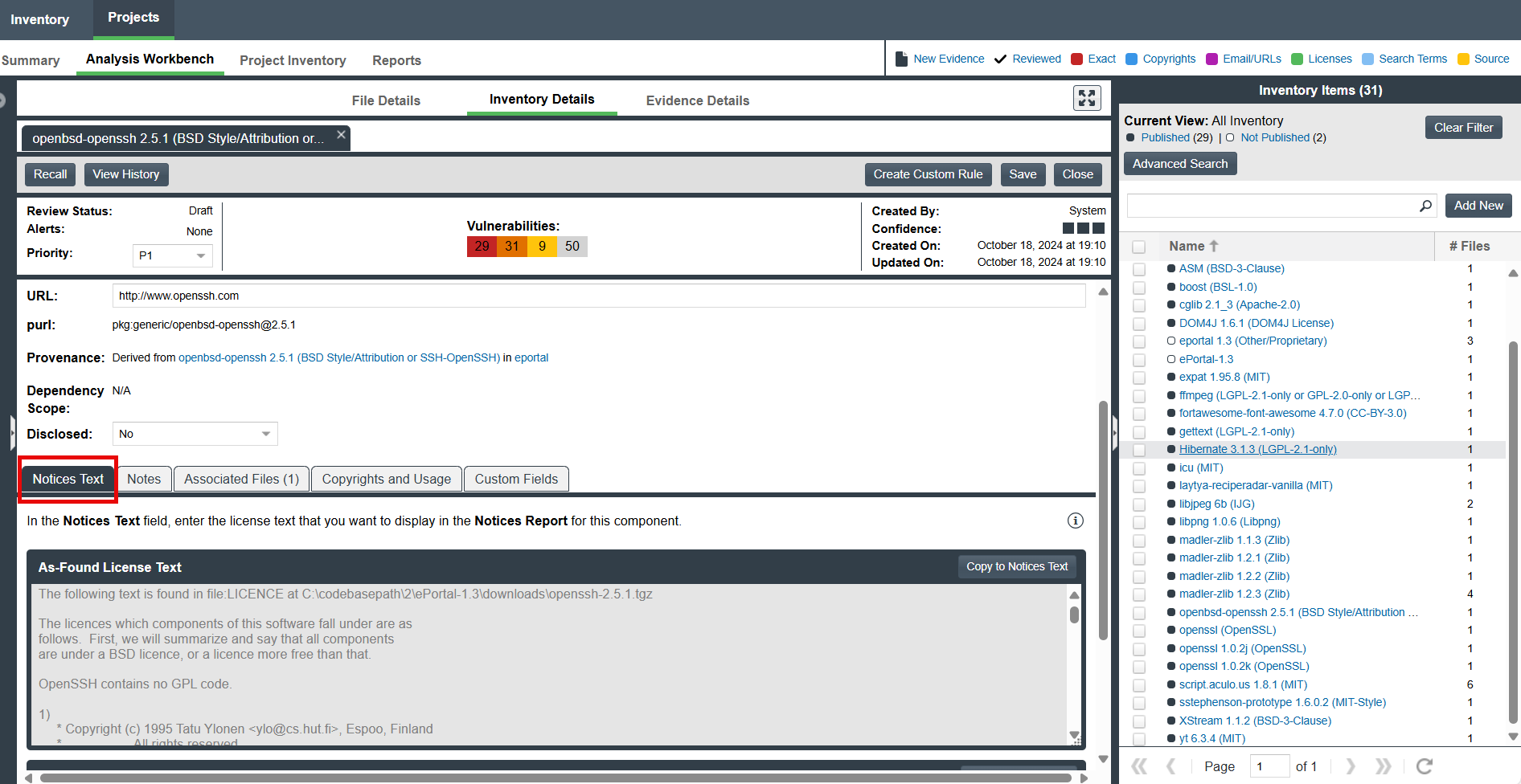 If no content exists in the Notices Text field and you want the Notices report to use the As-Found License Text content without any modification, you do not need to perform this procedure. By default, if the Notices Text field is empty and the As-Found License Text field is populated, the Notices report automatically pulls in the license content from the As-Found License Text field for the inventory item.