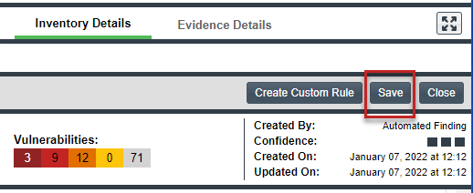 • If you are in the Analysis Workbench, click the Save button at the top of the Inventory Details tab. (Alternatively, click Close to shut down the tab for the current inventory item. You are prompted to save the inventory changes before the tab closes.)