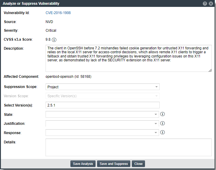 Click the Save and Suppress button to save the current exclusion analysis and suppress the vulnerability for the current project. (All editable fields must be completed to successfully suppress the vulnerability.)